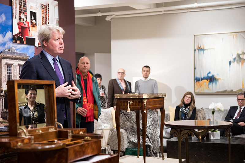 The theme of the evening was centered around “high tea” starting off in the Theodore Alexander showroom. Theodore Alexander hosted their special guest Mr. Charles Spencer, 9th Earl Spencer. Earl Spencer presented the Althorp Living History collection which is a collection of pieces created from the archives of Althorp House, his current home.